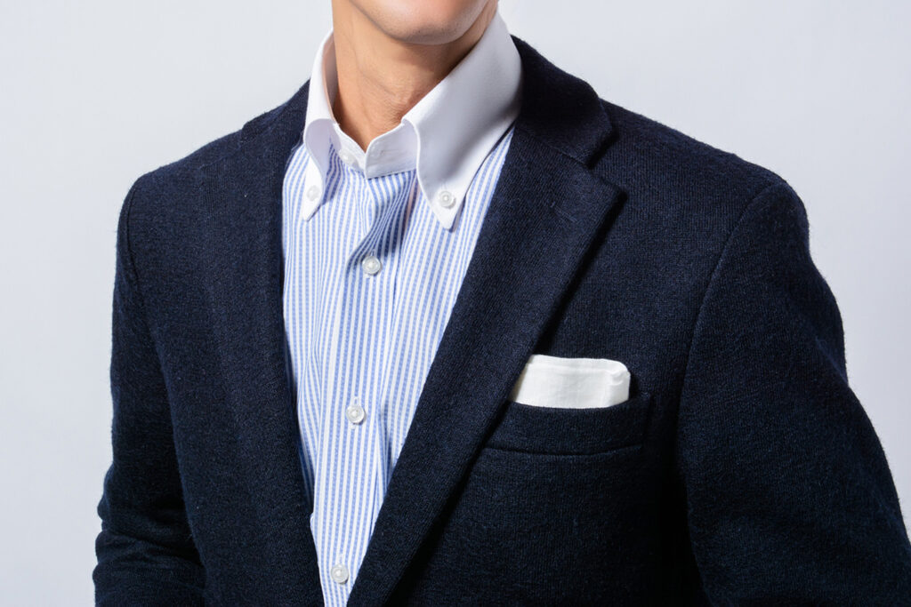 また、「クレリックシャツ」といえば、サックスブルーの無地、もしくはネイビーのブロックストライプの身生地に合わせるのが王道スタイルですね。