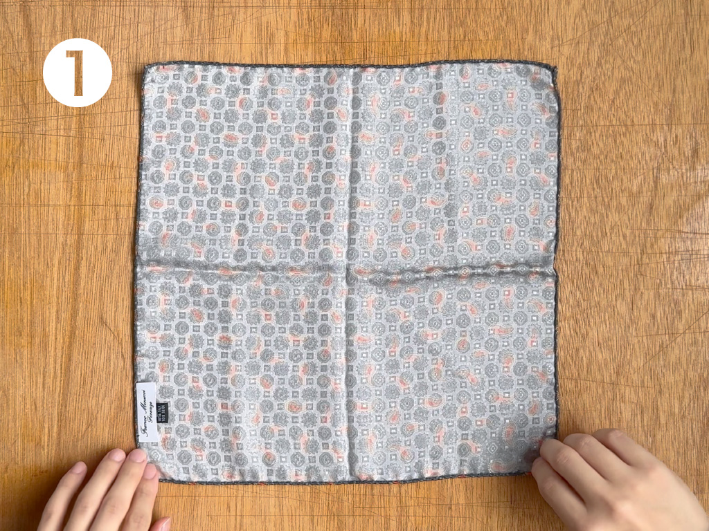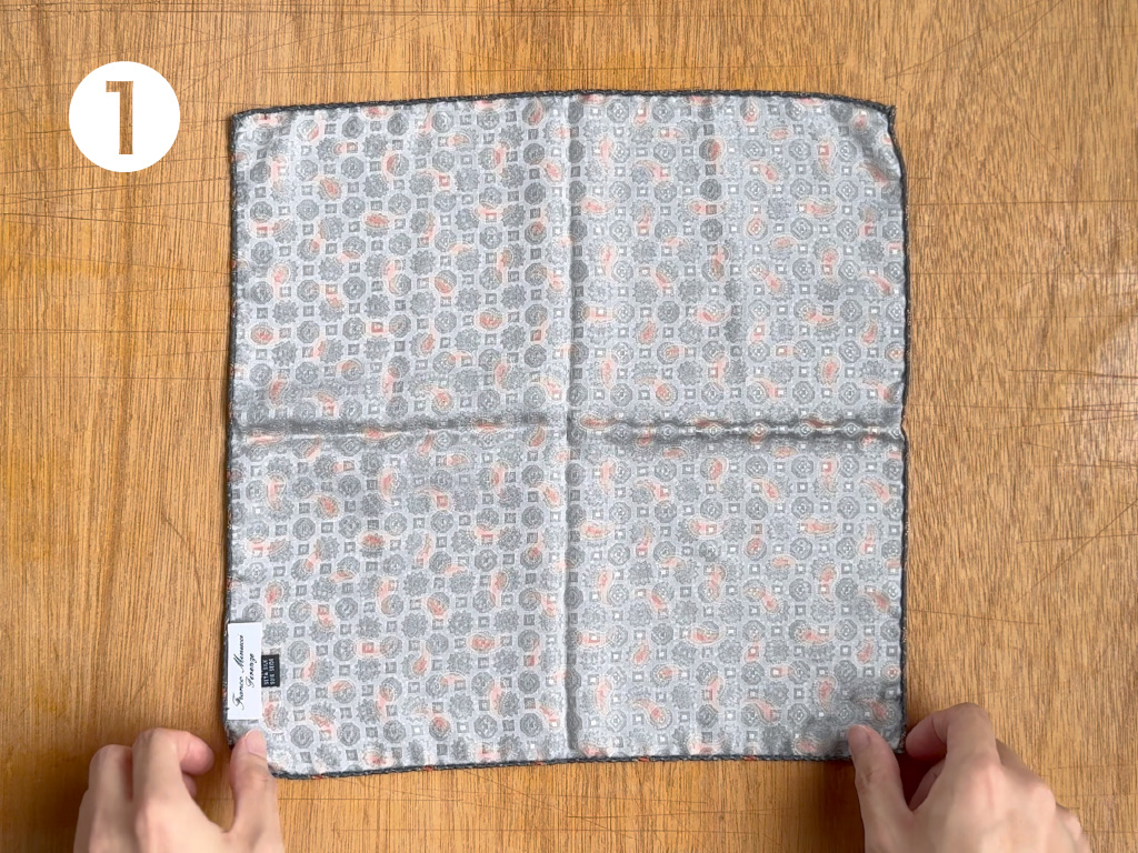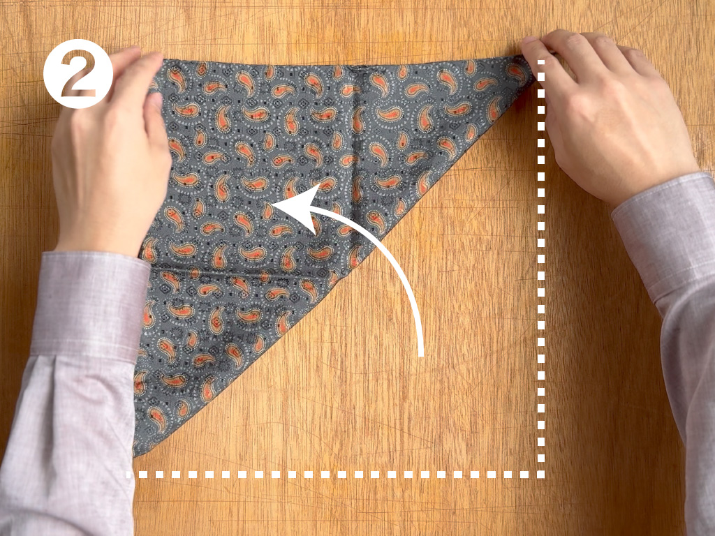 ②右下から左上に、斜め方向に折る (表側も裏側も、ポケットチーフの表面が見えるように折る)