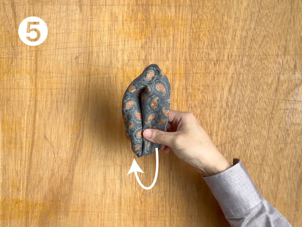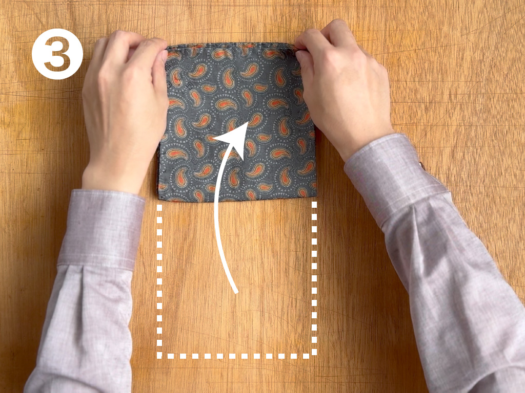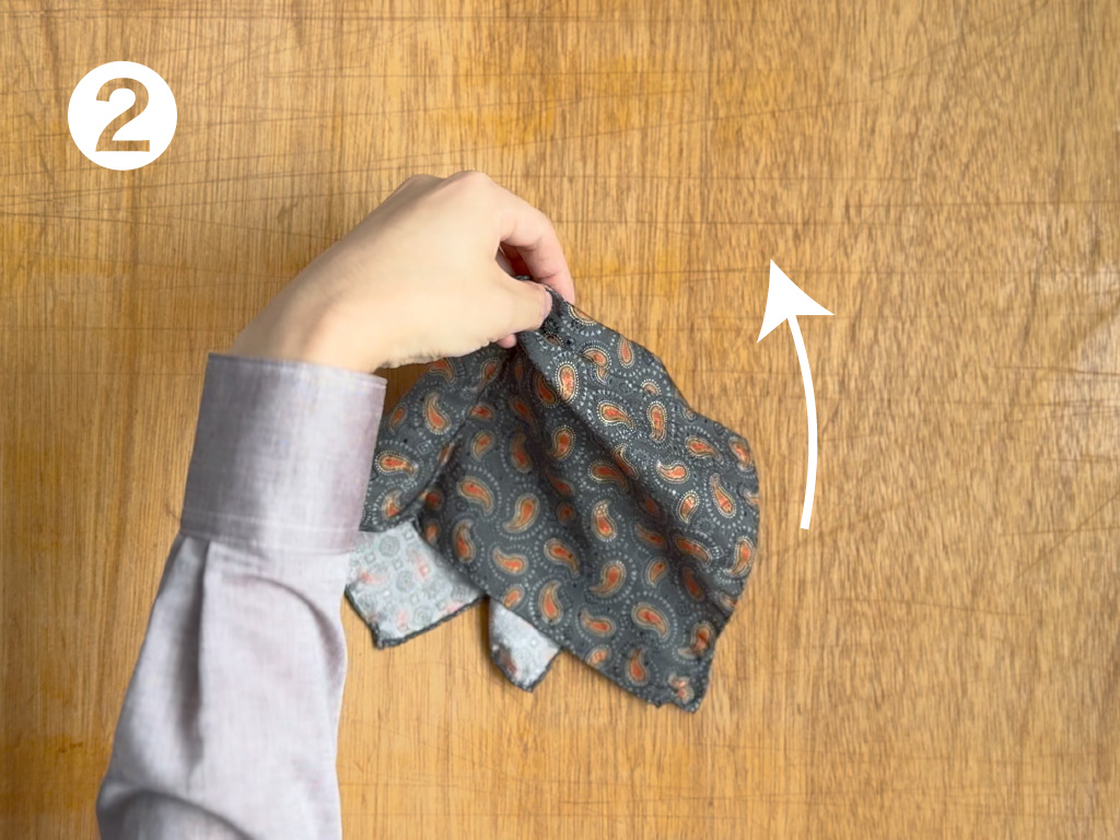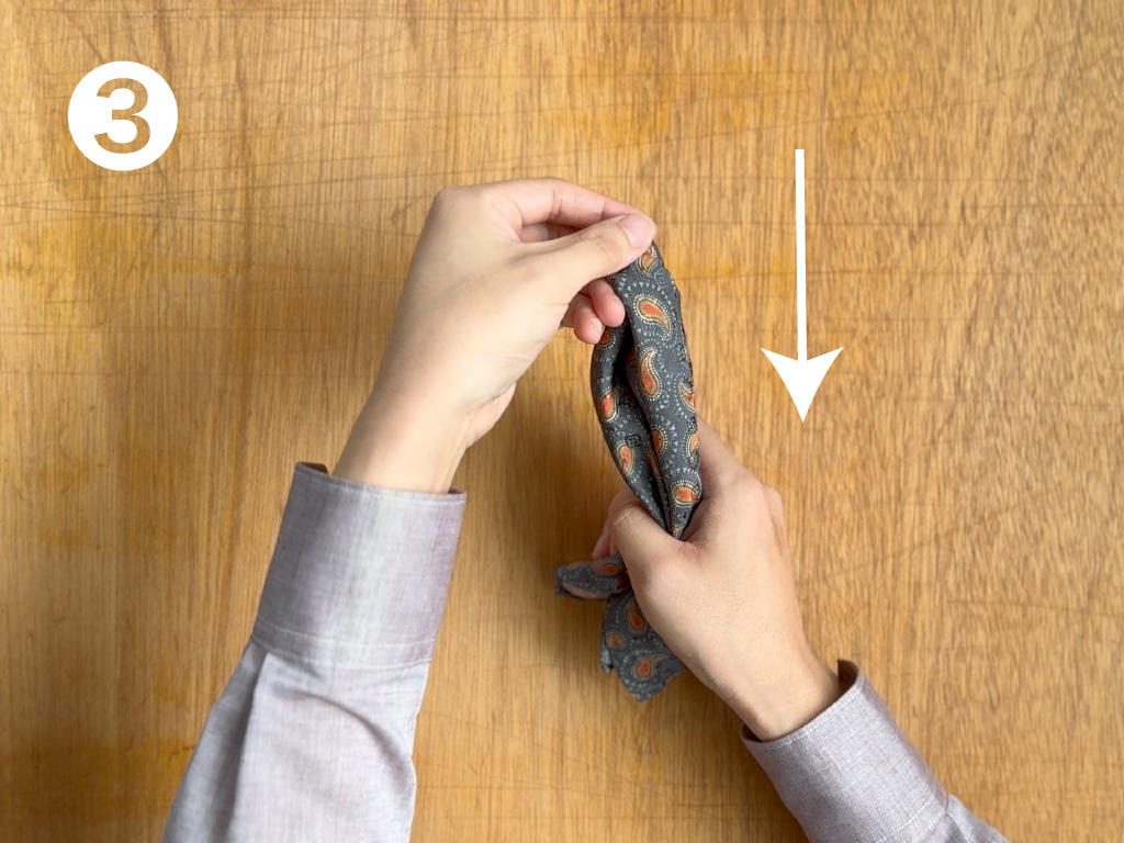 ③下から上に、縦方向に折る (ポケットチーフの角が、左上に集まるように折る)