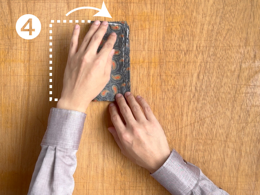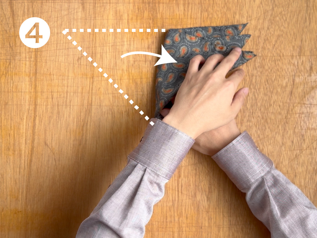 ④左から右に、横方向に折る (ポケットチーフの角が、右上に集まるように折る)