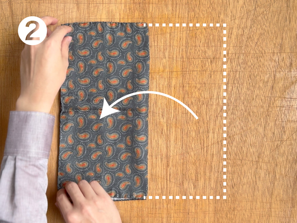 ②右から左に、横方向に折る (表側も裏側も、ポケットチーフの表面が見えるように折る)
