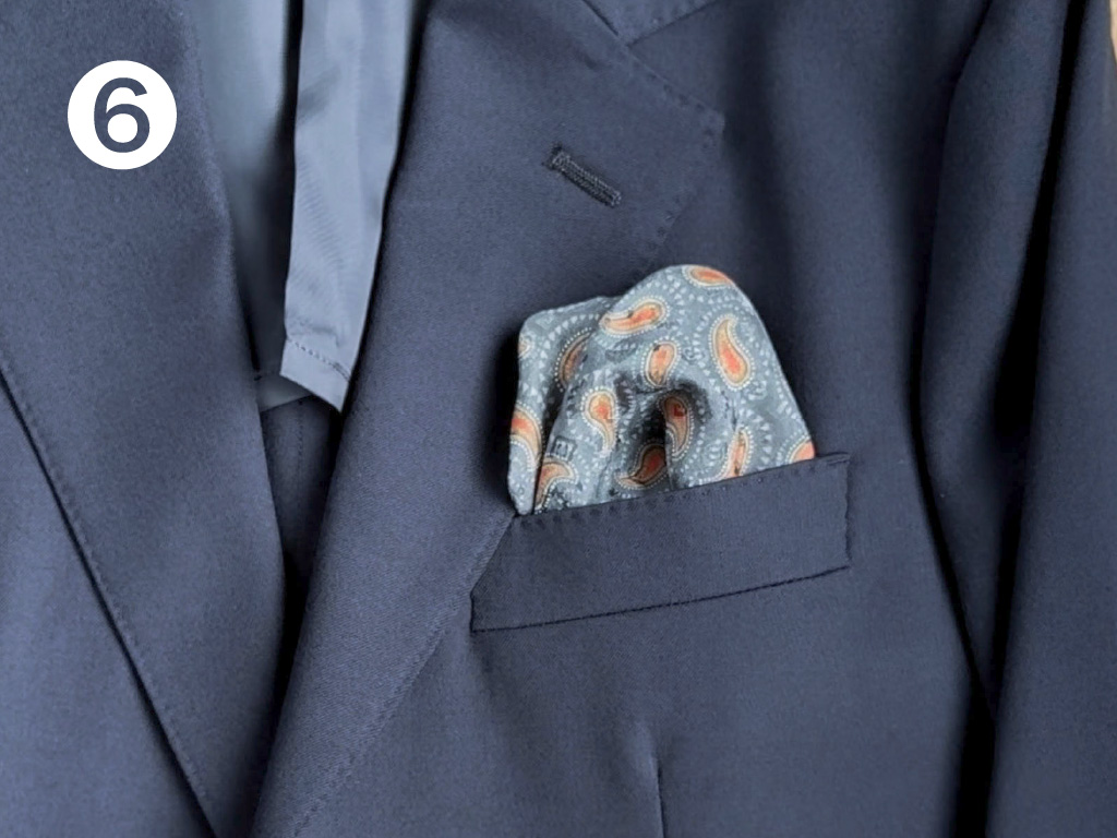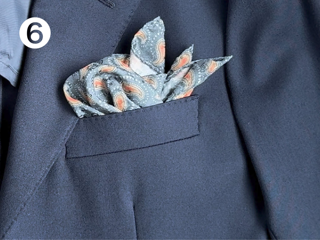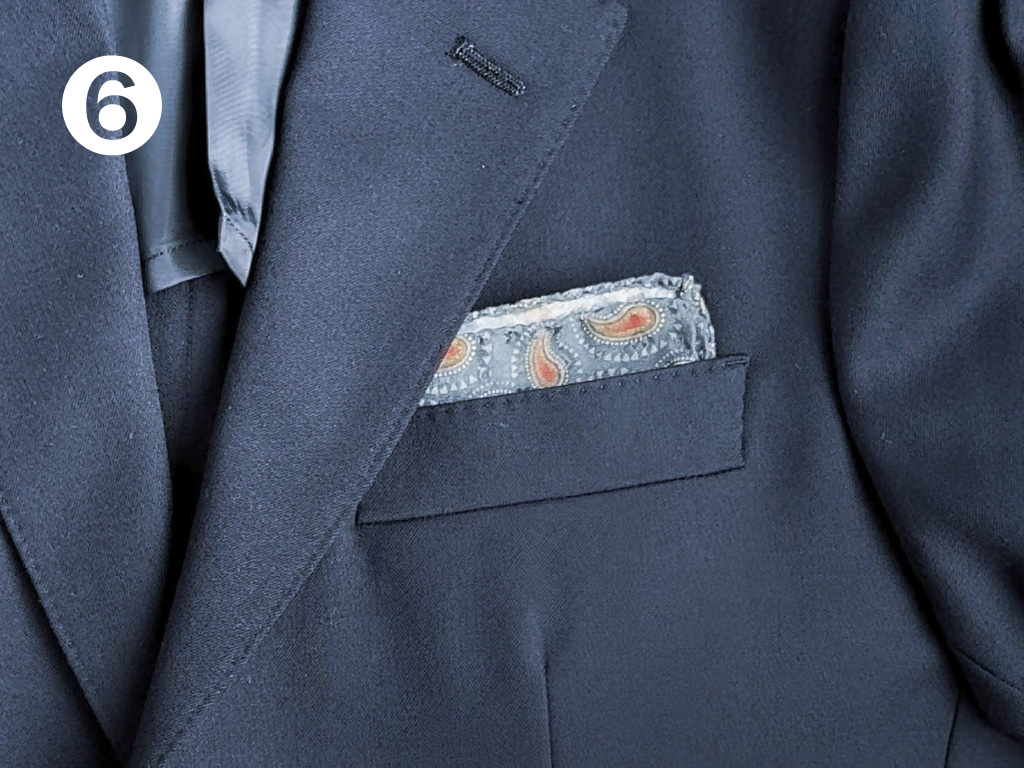折り畳んだパフの部分を表に出すことで、ポケットチーフの中心部と枠部分のデザインのコントラストが強調され、より胸元に視線が注がれるようになります。